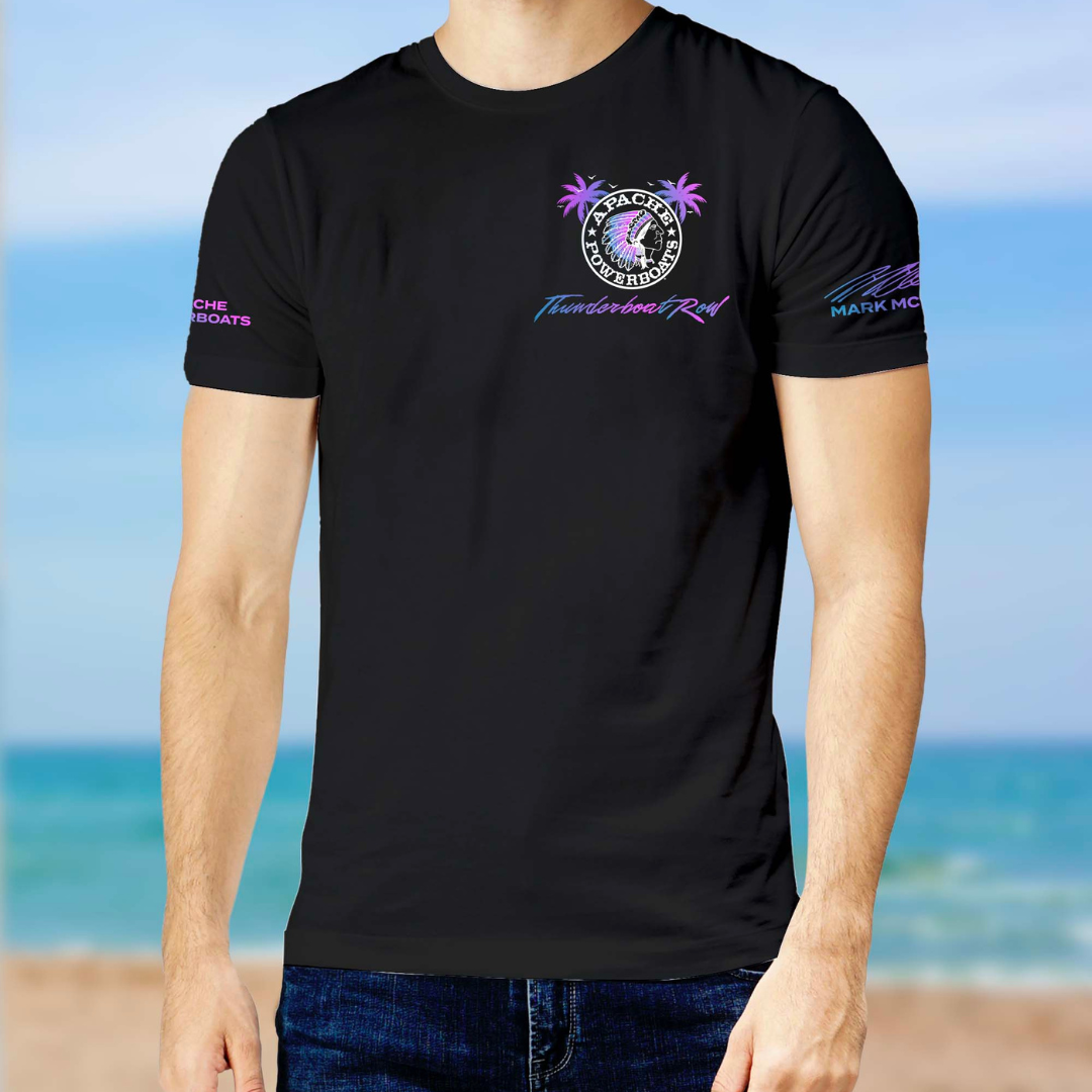 Attention to Detail: Our shirt features the Apache Powerboats® logo on the front left pectoral, striking art design at the center of the back, Apache Powerboats® lettering on the left sleeve, and Mark McManus’ signature on the right sleeve.