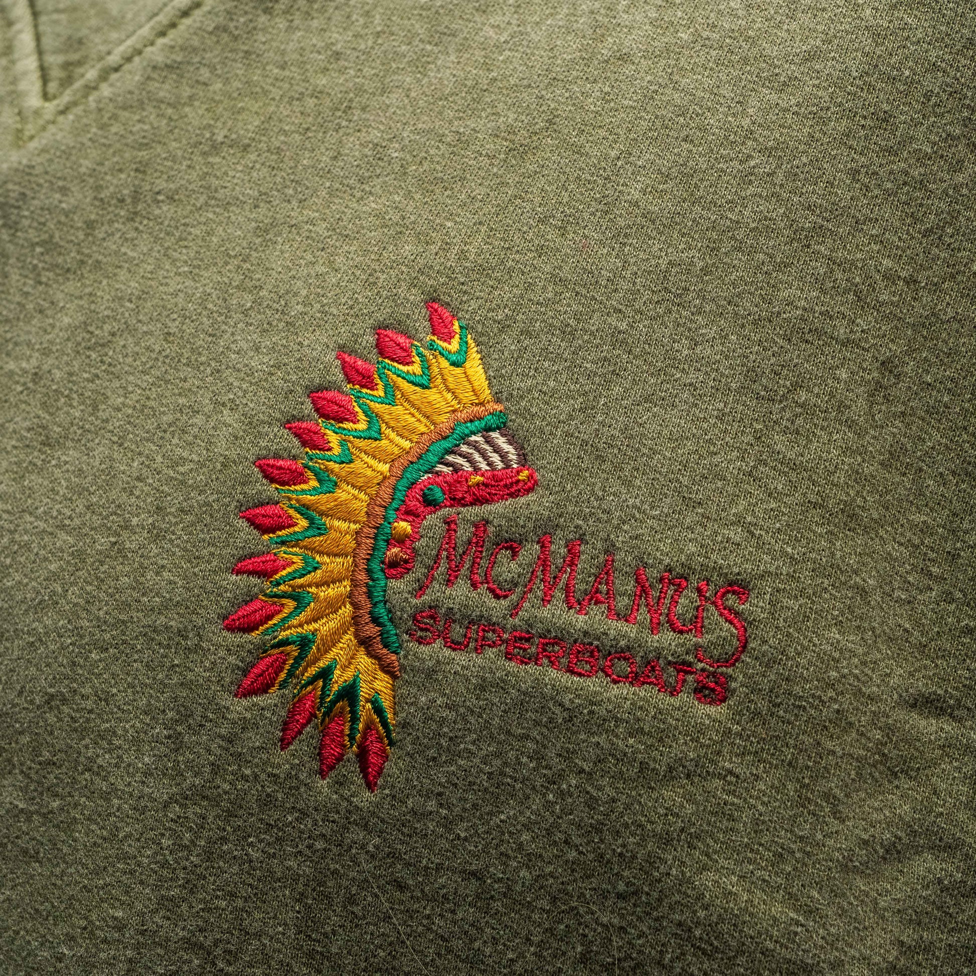 During the late 90s, the official Apache trademark was forfeited and could not be used. In that stretch, Mark McManus introduced the McManus Superboat name and the embroidered logo you see on these shirts to keep building ultimate powerboats. Under that badge he built the Comanche line. These boats were meant to be the most elite builds in the Apache family, shaped with the same grit and power that made Apache what it is.