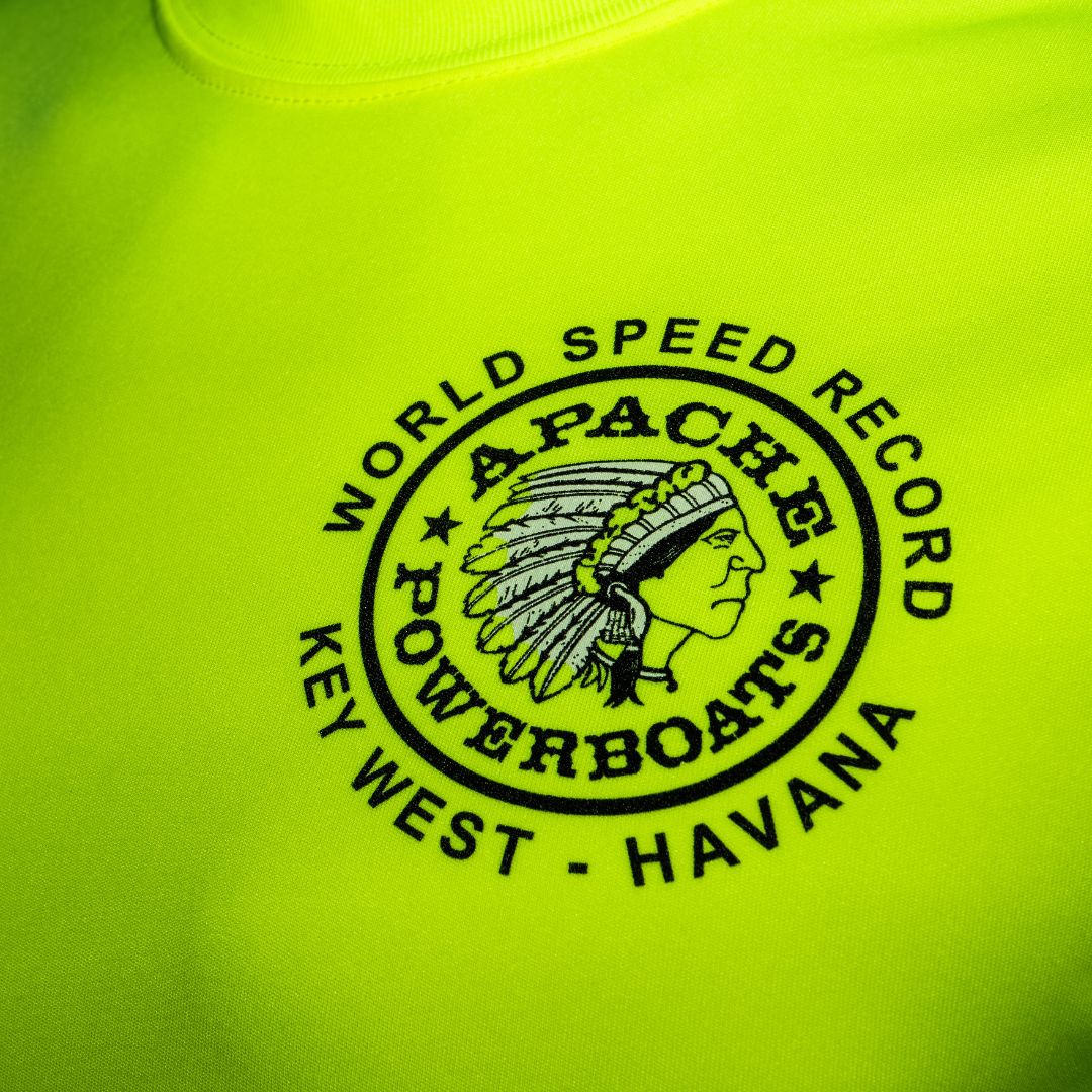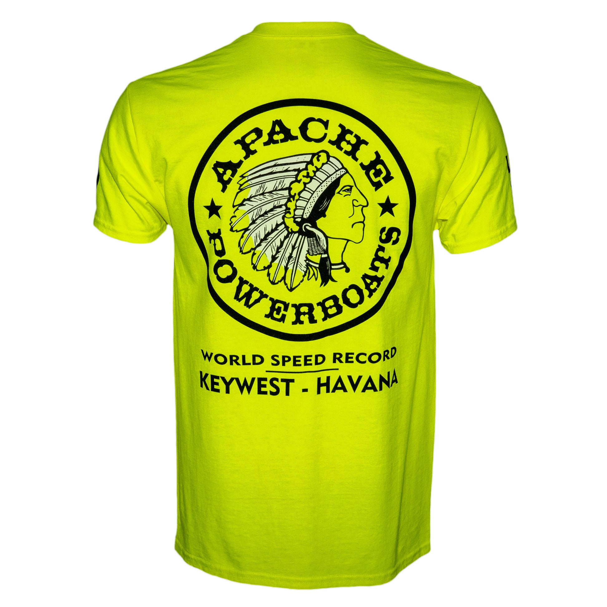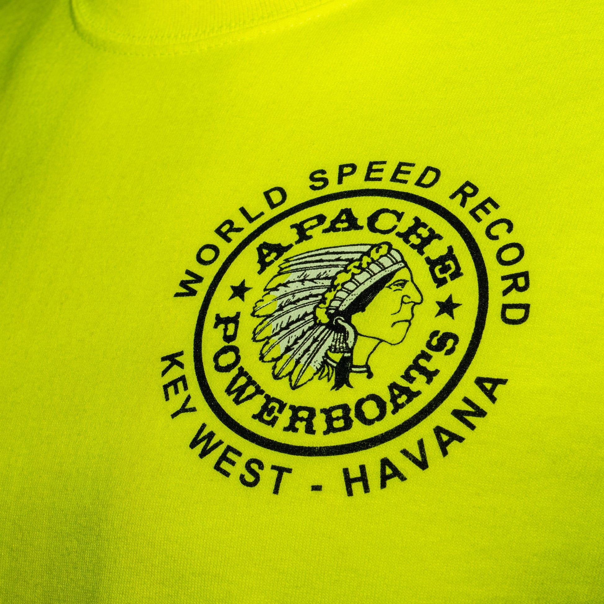 Celebrate the historic World Speed Record of the Apache Star with this standout Safety Green T-shirt, now also available in Safety Orange. Commemorating the iconic run between Key West and Havana on August 1, 2015, this shirt captures Apache’s relentless pursuit of speed and innovation. Whether on the water or off, the vibrant colors ensure you’ll stand out while honoring one of the most epic moments in powerboating history.
