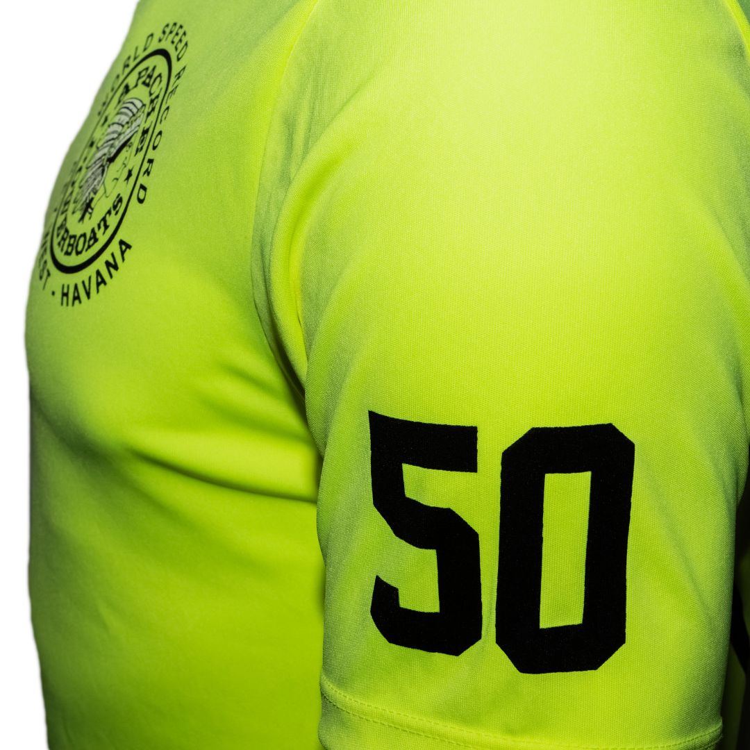 - Bold Commemorative Design: Features 5 distinct screen-printed areas, including the “Apache Powerboats World Speed Record” logo on the front left chest, the number “50” on the left sleeve, “U.S.A CUBA” on the right sleeve, and the large Apache Powerboats logo with the World Speed Record details on the back. The coordinates of the Apache Star’s record-setting run are printed vertically on the lower right front.